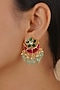 Featuring a 18kt gold plated jadau layered necklace studded with faux uncut polki stones, semi-precious beads and hangings, set in mixed metal. It is paired with a matching pair of earrings. Perfect for grand occasions like weddings and traditional festivities.