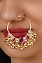 Featuring a 18kt gold plated jadau nose ring studded with faux uncut polki stones, semi-precious beads and hangings, set in mixed metal. Perfect for grand occasions like weddings and traditional festivities.