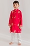 Featuring a deep pink kurta for boys in muslin base with gota patti and paisley motif embroidery. It is paired with soft cotton pyjama pants. Style it with a watch and a classic pair of juttis for a festive occasion or wedding ceremony.