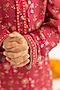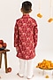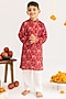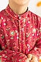 Featuring a maroon kurta for boys in muslin base with print. It is paired with cotton pants. Style it with juttis and a watch for a festive occasion.