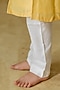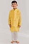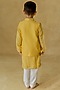 Featuring a mustard jacket for boys in chanderi base with motif embellishments. It is paired with a muslin kurta having gota detail and pyjama pants. Style it with a watch and a classic pair of juttis for a festive occasion or haldi ceremony.