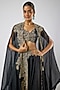 Featuring a black cape in organza base with floral and geometric motif embroidery. It is paired with a raw silk embroidered blouse and silk cowl pants. Accentuate it with kundan earrings, a sleek clutch and heels for a graceful look. Perfect for special celebrations, sangeet or festive ceremony.