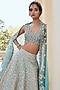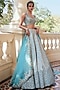 Featuring a blue lehenga in raw silk and organza base with resham and zardosi embroidery. It is paired with a matching embroidered blouse and a dupatta.