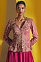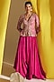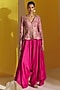 Featuring a fuchsia pink jacket in raw silk base with floral jaal, resham and zardosi hand embroidery. It is paired with silk cowl pants. Accentuate it with kundan earrings, a sleek clutch and heels for a graceful look. Perfect for special celebrations, sangeet or festive ceremony.