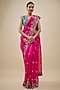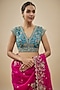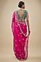 Featuring a hot pink saree in organza base with zardosi, resham and sequins embroidery. It is paired with a raw silk blouse. Accentuate it with statement jewellery and heels for a wedding, sangeet or engagement ceremony.