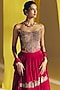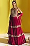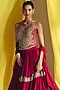 Featuring a maroon lehenga in georgette base with geometric motif, floral jaal, resham and zardosi hand embroidery. It is paired with a raw silk embroidered corset blouse and a georgette dupatta having bandhani detailing. Accentuate it with kundan jewellery, a potli bag and heels for a graceful look. Perfect for a wedding, sangeet or engagement ceremony.