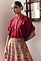 Mrunalini Rao presents a maroon lehenga in pure silk base with resham, pearl and zardosi hand embroidery. It is paired with a pleated shirt having mandarin collar. Elevate your designer lehenga set with bold jewelry and stylish heels for a stunning look at your sangeet or engagement ceremony.