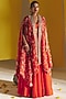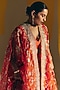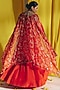 Featuring an orange gathered lehenga in silk base. It is paired with a raw silk embroidered blouse and an organza cape having jaal, zardosi and pearl embroidery. Accentuate it with kundan jewellery, a potli bag and heels for a graceful look. Perfect for a wedding, sangeet or engagement ceremony.