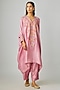 Featuring a pastel pink kaftan in silk base with paisley and floral hand embroidery. It is paired with straight pants. Accentuate it with polki earrings and block heels for festive celebrations, pooja or wedding ceremony.