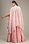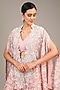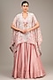 Featuring a peach cape in organza base with resham, zardosi and pearl embroidery. It is paired with an embroidered raw silk blouse and silk skirt. Accentuate it with statement jewellery and heels for a festive occasion or sangeet ceremony.