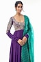 Featuring a purple anarkali in pure silk base with resham, pearls, zardosi, floral and geometric motif hand embroidery, including churidar sleeves. It is paired with a green organza dupatta having resham and sequins detail. Accentuate it with kundan polki or diamond jewellery and embellished heels for a wedding, sangeet or engagement ceremony.