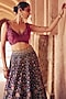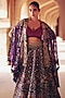 Featuring a purple lehenga in silk base with 3D organza floral embroidery. It is paired with a raw silk embroidered blouse and a silk organza hand embroidered cape. Accentuate the designer lehenga with kundan polki or meenakari jewellery, embellished heels and a potli bag for a bridal look, Perfect for your wedding, sangeet or engagement ceremony.
