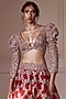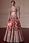 Featuring a red lehenga in raw silk and organza base with zardosi embroidery. It is paired with a matching blouse and a dupatta.