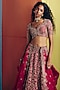 Featuring a red lehenga in raw silk base with peacock motif, paisley, zardosi and floral embroidery. It is paired with an embroidered blouse having asymmetrical sleeves and an organza dupatta. Accentuate it with kundan polki jewellery, a potli bag and heels for a graceful look. Perfect for a wedding, sangeet or engagement ceremony.