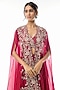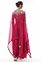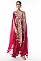 Featuring a red cape in sheer organza base with pearl and zardosi embroidery. It is paired with a blouse and cowl pants. Accentuate it with kundan polki jewellery and embellished heels for festive celebrations, weddings or sangeet ceremony.