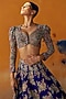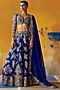 Featuring a royal blue lehenga in raw silk base with resham and zardosi embroidery. It is paired with an embroidered blouse having leg-o-mutton style sleeves and an organza embroidered dupatta. Accentuate this designer lehenga set with statement jewellery and heels for a bridal look.