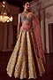 Featuring a yellow lehenga in raw silk and organza base with resham and zardosi embroidery. It is paired with a contrasting embroidered blouse and a peach dupatta.