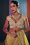 Featuring a yellow lehenga in satin organza base with jaal, pearl and zardosi embroidery. It is paired with a raw silk embroidered blouse having scalloped neckline and an organza embroidered dupatta. Accentuate it with kundan polki jewellery, a potli bag and heels for a graceful look. Perfect for a wedding, sangeet or engagement ceremony.
