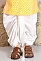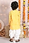 Featuring a yellow leheriya kurta for boys in cotton base with golden zari embroidery, front button opening, wooden buttons and gota detailing. It is paired with white dhoti pants having an elasticated waist and gota detailing. Style it with juttis and a watch for a festive occasion, haldi or pooja ceremony.
