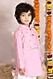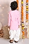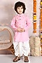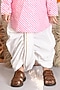 Featuring a pink leheriya kurta for boys in cotton base with golden zari embroidery, front button opening, wooden buttons and gota detailing. It is paired with white dhoti having an elasticated waist and gota detailing. Style it with juttis and a watch for a festive occasion or pooja ceremony.