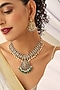Featuring a gold finish handcrafted temple necklace studded with green stone, set in brass. It is paired with a matching pair of earrings. Perfect for festive occasions or pooja ceremonies.