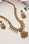 Featuring a gold finish handcrafted temple long necklace studded with red and green stones, set in brass. It is paired with a matching pair of earrings. Perfect for festive occasions or pooja ceremonies.