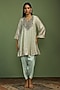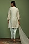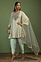 Featuring a mint kurta in georgette base with mirror and sequins embroidery. It is paired with satin pants and a net dupatta. Style it with polki earrings and block heels for festive gatherings or pooja ceremony.