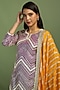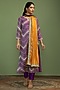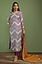 Featuring a purple long kurta in georgette base with gota work. It is paired with raw silk pants and a mustard chinon dupatta. Style it with polki earrings and block heels for festive gatherings or pooja ceremony.