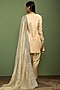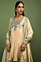 Featuring a sand-colored kurta in tissue base with mirror embroidery. It is paired with satin pants and a tissue dupatta. Style it with polki earrings and block heels for festive gatherings or pooja ceremony.
