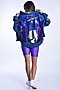 Featuring a blue jacket in denim base. It is paired with a contrasting purple sports bra and tights.