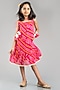 Featuring a pink dress for girls in kota and bandhani base with an adjustable dori straps, handmade flowers and pearl button detailing. Style this designer dress with sandals and a cute headband for any festive occasion or ceremonial events.