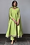 Featuring a lime green kalidar anarkali in cotton viscose base with stripes. It is paired with matching pants having a breathable cotton lurex base and an organza dupatta having gota detailing and a fringed edge.