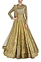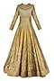 This set features an olive green and gold flared kalidaar anarkali kurta in chanderi base with hand foil print all over the front, back and ghera. It is paired with matching gold net dupatta with swarovski work all over.