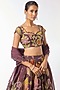 Featuring a deep burgundy lehenga in organza base with kalamkari handpainted, hand and machine embroidery. It is paired with a raw silk crop blouse and an organza dupatta. Accentuate it with statement jewellery and heels for a wedding or sangeet ceremony.