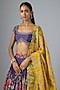 Featuring a purple lehenga in bangalore silk base with kalamkari print and hand embroidery. It is paired with a raw silk blouse and a dupatta. Accentuate it with statement jewellery, embellished block heels and a potli bag for a wedding, sangeet or engagement ceremony.