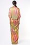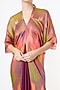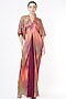 Featuring a multi colored draped gown in satin base with print and dolman sleeves.