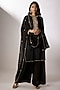 Featuring a black kurta in silk base with zardosi and pearl embroidery. It is paired with crepe pants and an organza dupatta having zardosi work. Accentuate it with statement earrings and heels for a festive look.