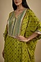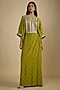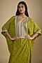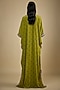 Featuring a green kaftan crepe in crepe base with mirror and gota embroidery, including digital print. Accentuate it with statement jewellery and wedges, perfect for sangeet ceremony, festive brunches or contemporary celebrations.