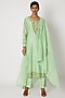 Featuring a mint green kurta in chanderi silk and dupion cotton base with zardosi and aari hand embroidery. It is paired with matching pants and a dupatta.