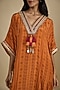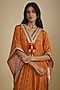 Featuring an orange kaftan dress in crepe base with mirror and gota embroidery, including digital print. Accentuate it with statement jewellery and wedges, perfect for sangeet ceremony, festive brunches or contemporary celebrations.