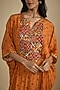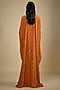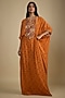 Featuring an orange kaftan dress in crepe base with zardosi, abla, sequin embroidery and digital print. Accentuate it with statement jewellery and wedges, perfect for sangeet ceremony, festive brunches or contemporary celebrations.