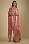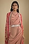 Featuring a red maxi dress in crepe base with pearl and sequins embroidery, including digital print. It is paired with a georgette striped cape and a tasseled belt. Accentuate it with statement jewellery and wedges, perfect for sangeet ceremony, festive brunches or contemporary celebrations.