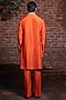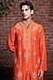 Featuring an orange kurta in tussar silk base with kasab dori, resham and mirror work. It is paired with flared pants. Style it with mojaris for a festive occasion, wedding or engagement ceremony, exuding charm and elegance.