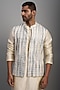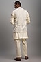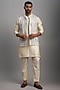 Featuring a pastel blue bundi jacket in chanderi brocade base with tie-dye including sequins and machine thread embroidery. It is paired with a matching chanderi kurta and chanderi jacquard pants.