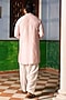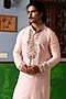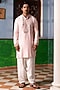 Featuring a pink kurta in tussar silk base with rose gold kasab and mirror work. It is paired with white pyjama pants. Style it with mojaris for a festive occasion, wedding or engagement ceremony, exuding charm and elegance.