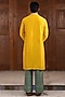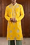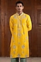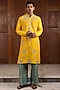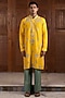 Featuring a sunflower yellow kurta in tussar silk base with kasab, resham and mirror dori work. It is paired with flared pants. Style it with mojaris for a festive occasion, haldi or engagement ceremony, exuding charm and elegance.