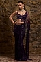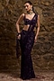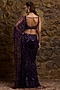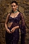 Featuring an aubergine draped saree in net base with sequins and glass bead hand embroidery. It is paired with a blouse. Accentuate it with zircon jewellery and heels for wedding, sangeet or cocktail ceremony.