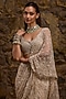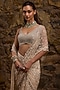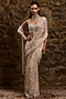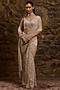 Featuring a champagne gold draped saree in net base with sequins and glass bead hand embroidery. It is paired with a blouse. Accentuate it with zircon jewellery and heels for wedding, sangeet or cocktail ceremony.
