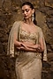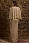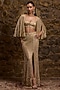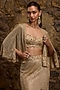 Featuring a gold skirt in net base with sequins, crystal and glass bead hand embroidery. It is paired with a floral blouse and a beaded cape. Accentuate with statement jewellery and heels for a sangeet or cocktail ceremony.