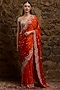 Featuring a marigold colored saree in shammu satin and net base with sequins and glass bead hand embroidery. It is paired with a blouse and an underskirt. Accentuate it with zircon jewellery and heels for wedding, sangeet or cocktail ceremony.